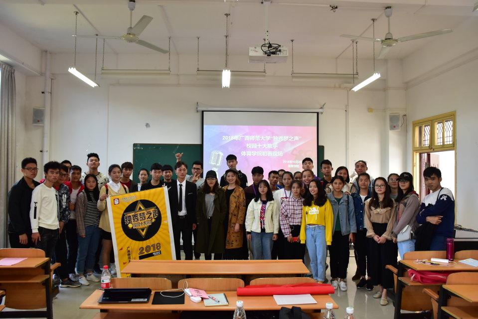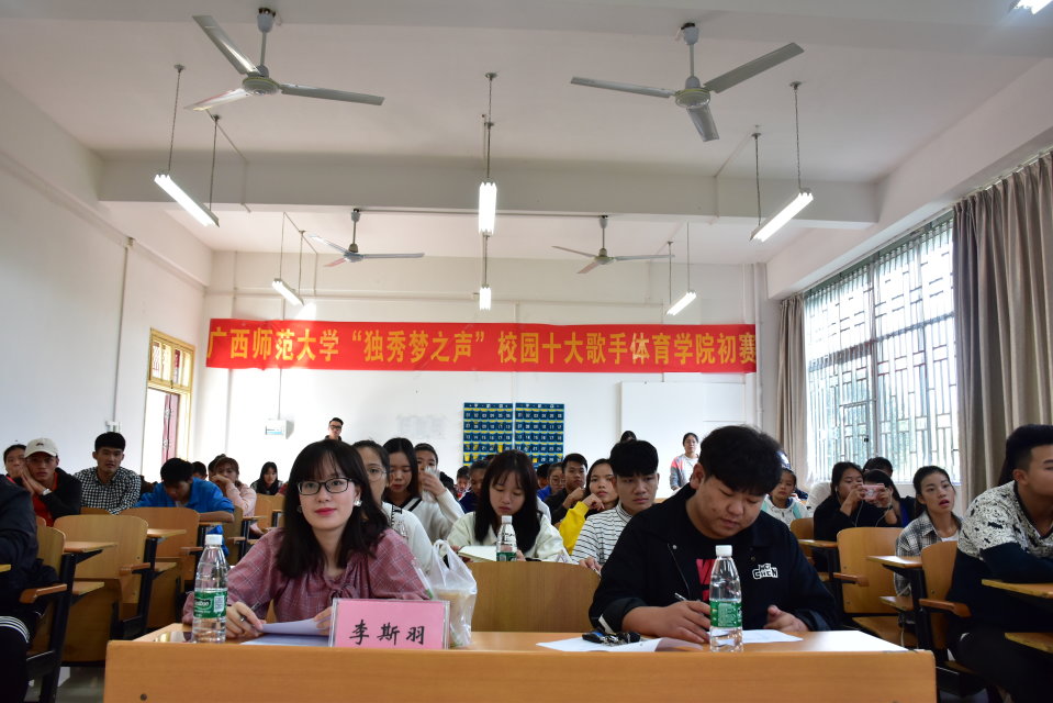 为了丰富校园文化生活,努力营造积极向上、健康文明的校园文化气氛,为学生提供一个展示自己才华的舞台。10月28日上午9点30分,体育学院于院办104教室隆重举行2018年广西师范大学“独秀梦之声”校园十大歌手体育学院初赛。邀请到的评委嘉宾有来自校艺术团的李睿,2017年校园十大歌手季军李斯羽。