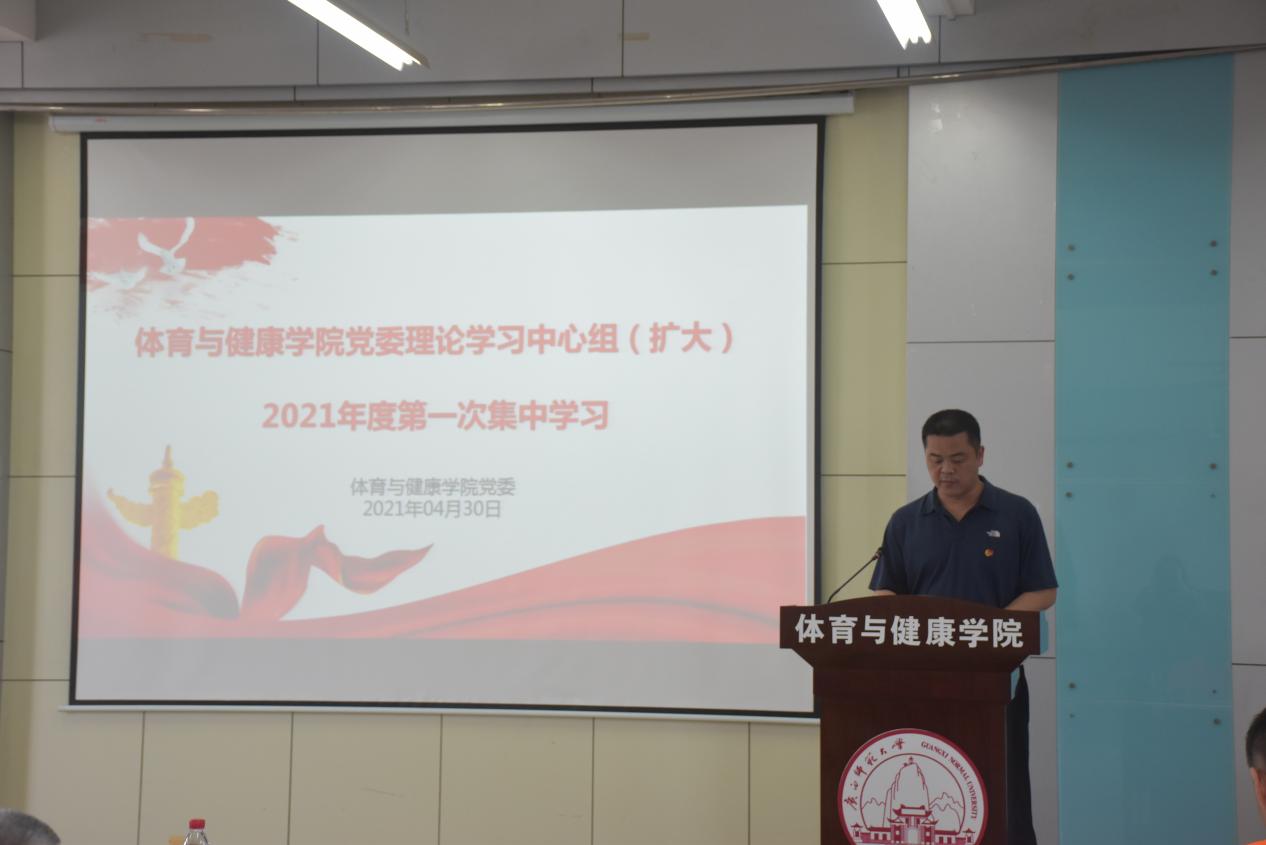 2021年4月30日,中共广西师范大学体育与健康学院委员会理论学习中心组(扩大)2021年度第一次集中学习在学院503室召开。学院全体班子成员、党委委员、纪委委员、工会主席、工会副主席、办公室主任、人事干事、教研室主任、团委书记、各支部书记、专职辅导员及各学生党支部支委参加会议。副院长谢伟同志主持会议。