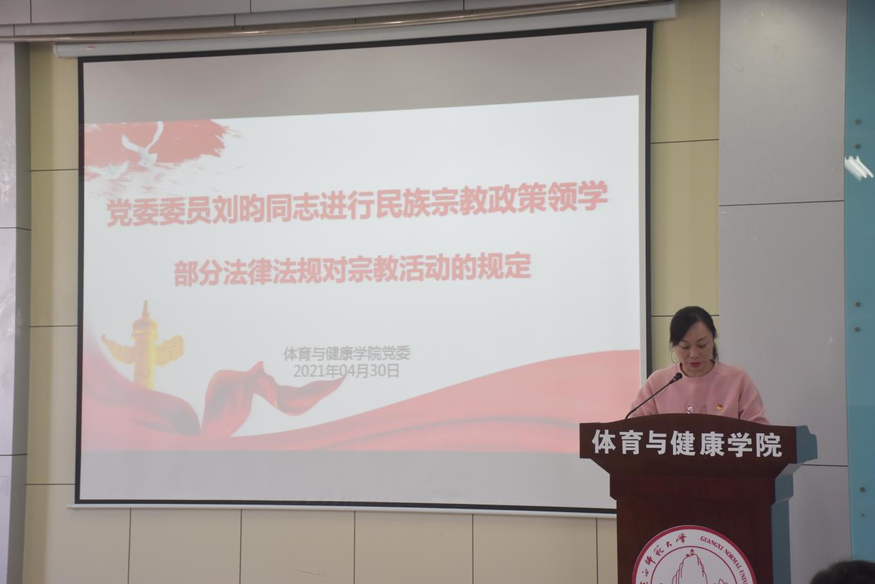 接下来,学院党委委员刘昀同志带领大家进行民族宗教政策学习——部分法律法规对宗教活动的规定。刘昀同志带领大家进行民族宗教政策的学习,让大家了解了我国部分法律法规对宗教活动的规定,说明了做好民族宗教工作,对于巩固和壮大最广泛的爱国统一战线,增进民族团结,维护祖国统一,促进现代化建设事业和构建社会主义和谐社会,都有着十分重要的意义。我们一定要“坚持保护合法,制止非法,抵御渗透,打击犯罪,保证宗教活动依法规范有序进行”。