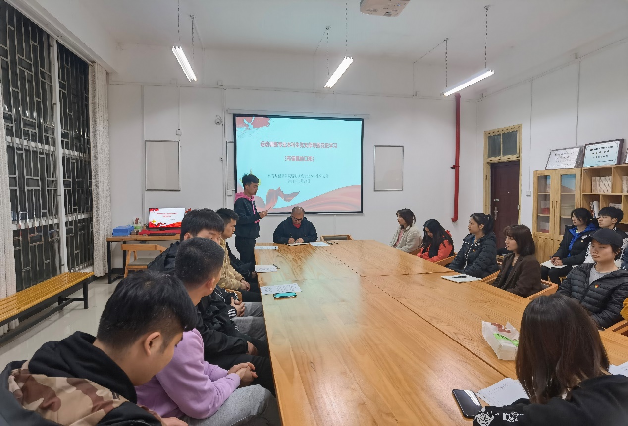 “敢为天下先,日月换新天。壮阔百年史,千秋万代明。”追忆党的百年历史,重温党的奋进故事,将党史铭记在心,从党史中汲取前行的力量与勇气。2021年是中国共产党诞生一百周年。一百年砥砺奋进,一百年风雨兼程,一百年光辉历程,一百年丰功伟绩。为推进党史学习和廉洁教育学习,2021年3月23日晚,体育与健康学院运动训练本科生党支部开展运动训练专业本科生党支部专题党史学习。