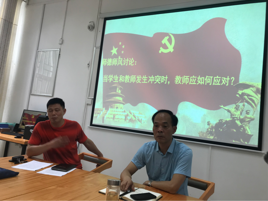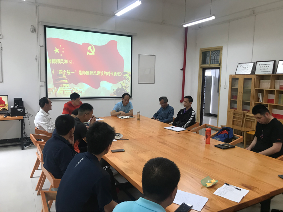 会议第一项议程,由球类党支部书记刘闯老师发言,他指出教师是人类灵魂的工程师,是太阳底下最神圣的职业,师德是一个教师的灵魂,是搞好教育教学的前提,更是每一位教师的立身之本,充分认识开展师德师风教育的重要性、必要性。展开“四个统一”师德师风建设是时代的要求。做为一名合格的人民教师需要坚持教书育人相统一,坚持言传身教相统一,潜心问道和关注社会相统一,学术自由与规范相统一。随后,师德师风讨论环节,支部成员就当学生和教师发生冲突时教师应如何面对依次发言并分享做法。最后由庞晓宇书记总结,他指出教师要端正教师态度,提高自身修养,维护教师形态和团队,尊重、爱护,用心去培养学生,学会冷静,避开冲突。
