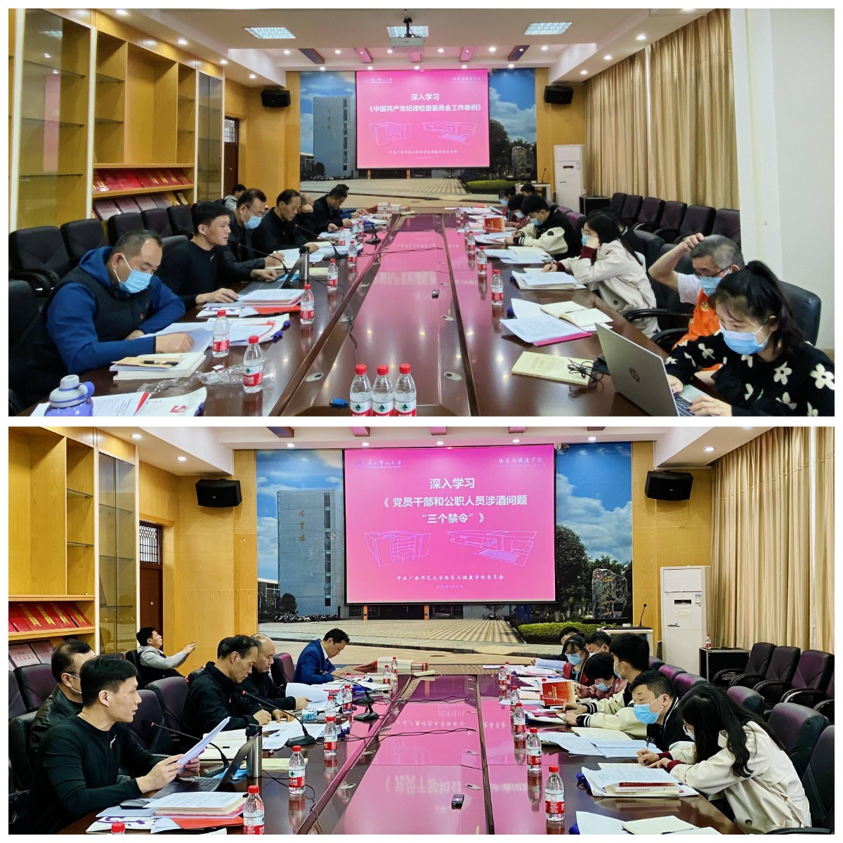 第二项议程,由党委副书记、纪委书记领学《中国共产党纪律检查委员会工作条例》、《中共广西壮族自治区委员会关于大力推进清廉广西的意见》、《党员干部和公职人员涉酒问题“三个禁令”》。他强调,全院师生要深入贯彻全面从严治党战略方针,坚决把“两个维护”作为最高政治原则和根本政治责任,坚持不懈地推进清廉体健院的建设,切实加强廉洁自律的意识教育,浓厚清廉体健院的氛围,以强有力的政治监督确保学院决策部署贯彻落实到位。
