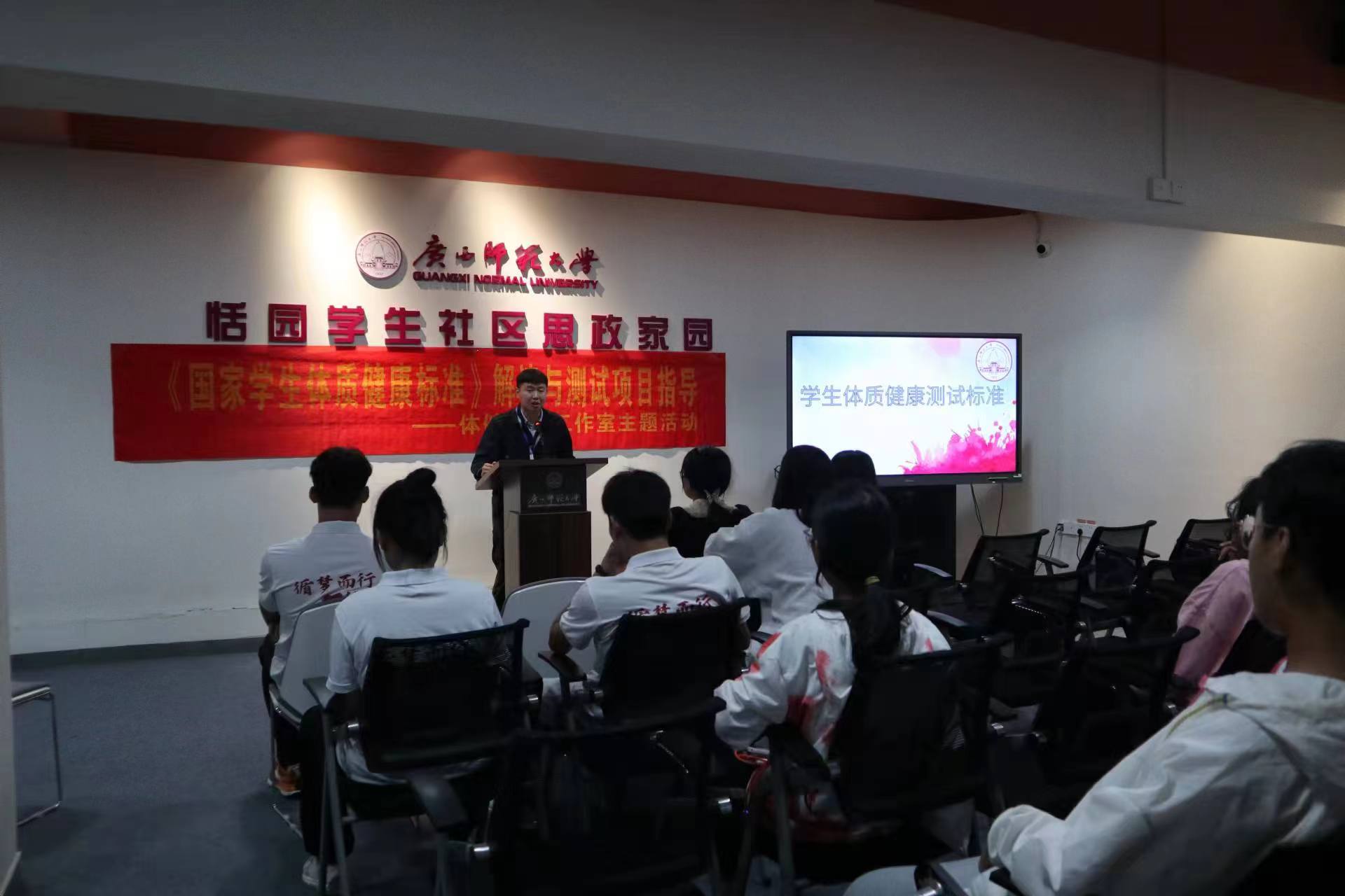 2023年10月12日下午17时,“体健达人工作室”为切实加强高等学校学生体育工作,培养大学生养成良好的锻炼习惯,在广西师范大学雁山校区恬园学生社区学生之家指导在校大学生了解《国家学生体质健康标准》,系统解读体质健康测试的相关内容。包含具体的评价指标、测试标准及相关注意事项。如男子 1000 米、女子 800 米中长跑的步频、步伐、呼吸节奏、训练方法技巧;坐位体前屈的测试要领、技巧及易错方法;仰卧起坐的标准动作要领、评分方法;立定跳远的正确预摆姿势、发力要点及训练方法等内容。