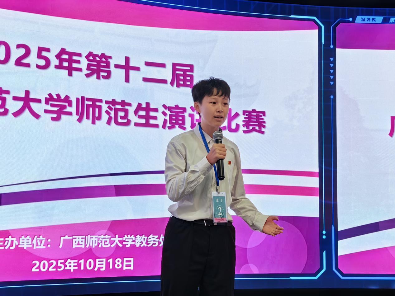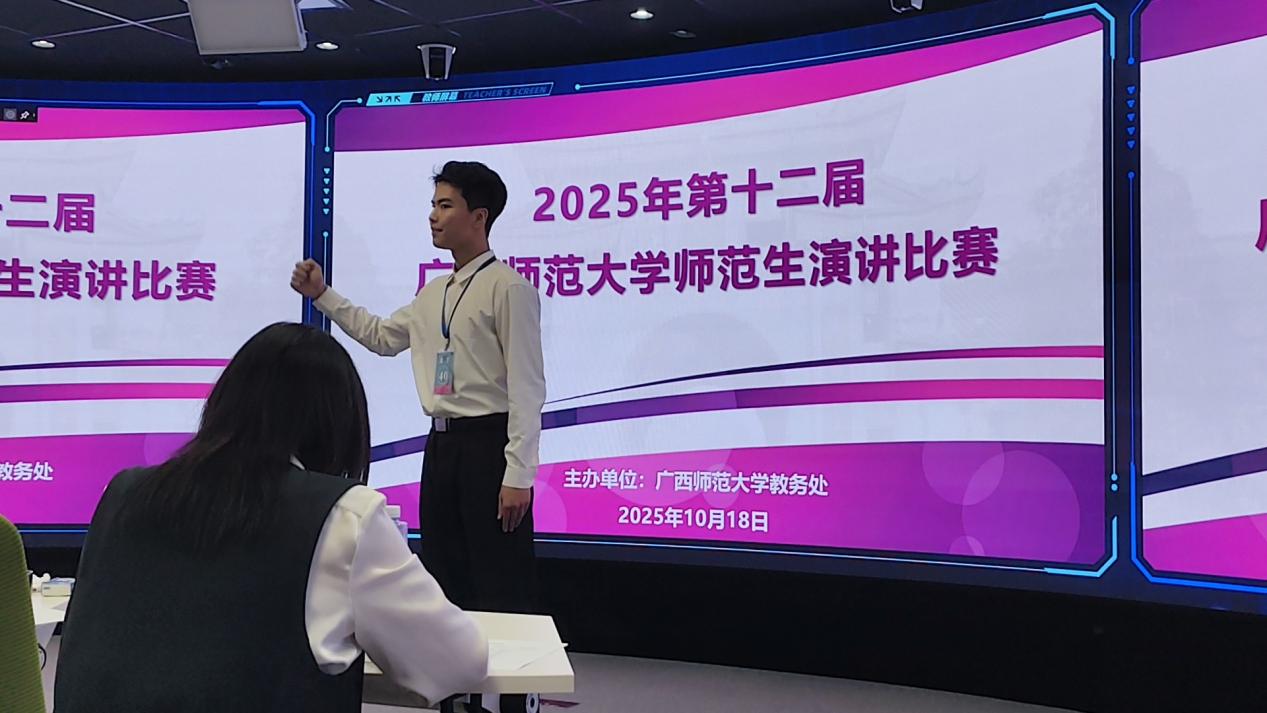 为展示我校师范生风采,进一步营造尊师重教氛围,2025年10月18日,广西师范大学开展了以“铸魂强师,共绘教育蓝图”为主题的师范生演讲比赛。我院2024级体育教育专业靳璐瑶、张益硕两位同学代表学院参赛,在22名选手的激烈角逐中斩获佳绩:靳璐瑶获一等奖并入围区级比赛,实现我院赛事新突破;张益硕获二等奖。