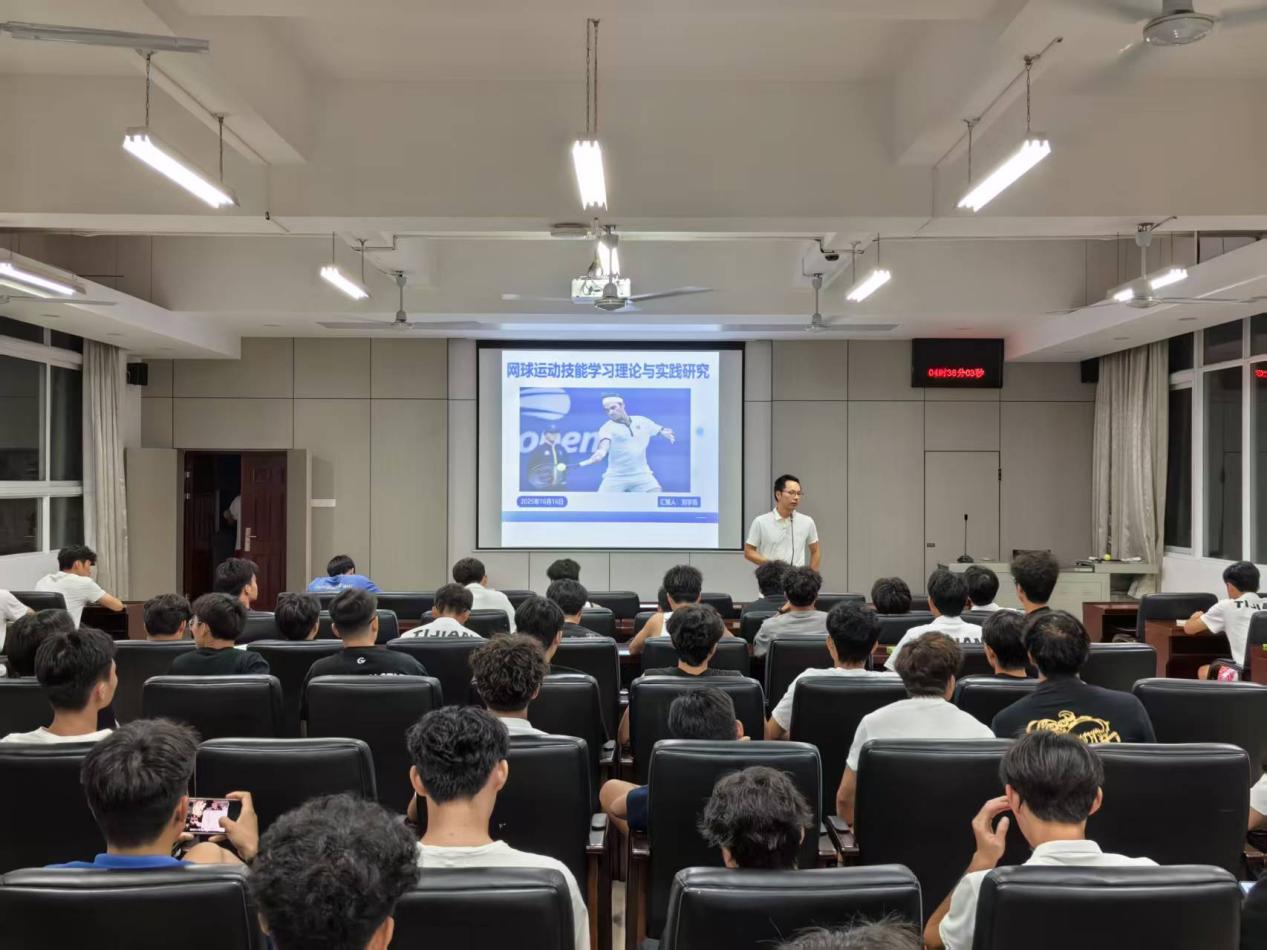 2025年10月16日晚,由广西师范大学教师教学发展中心主办,体育与健康学院承办网球运动技能学习理论与实践专题报告在体育与健康学院503教室进行,体育与健康学院网球专任教师刘宇昂担任主讲,共100余人参加报告会。