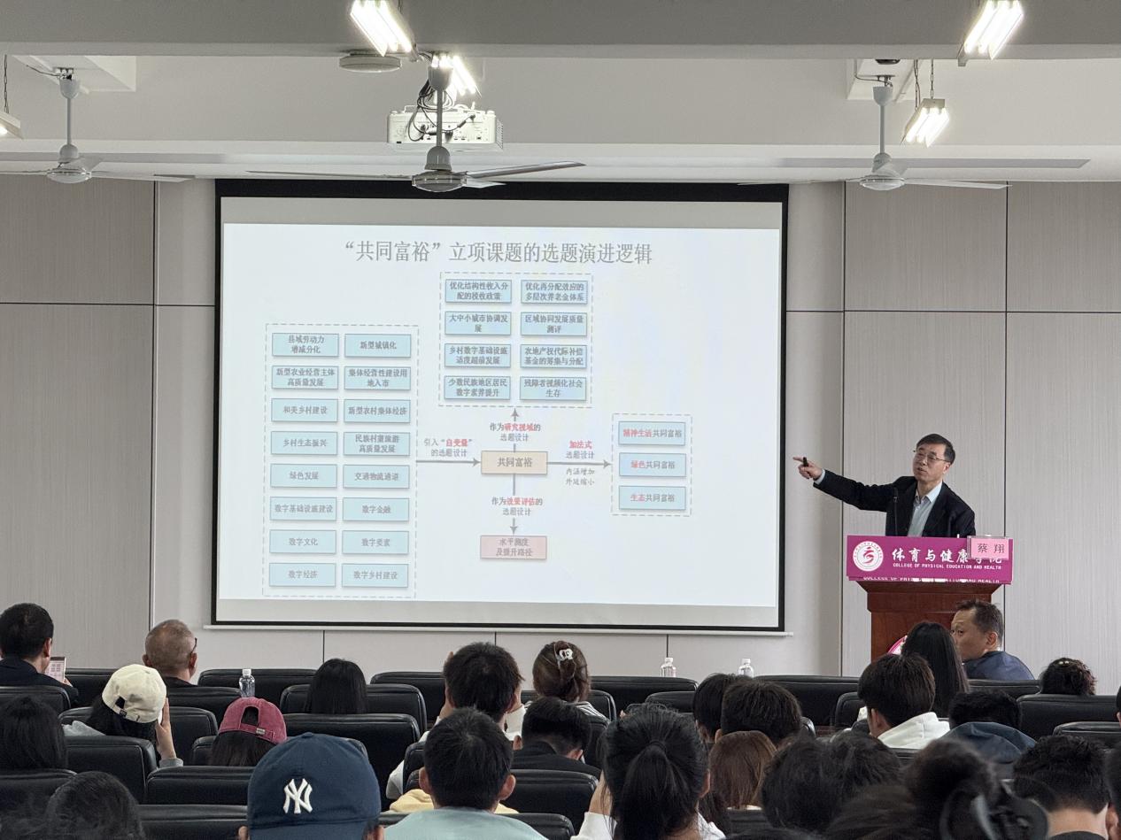会上,蔡翔教授在开篇中指出,选题需紧跟国家政策与重要会议精神,核心是强化“目标导向”与“问题意识”。他还介绍了题目设计的“加减法”“递进式”等方法,详解“选题说明”撰写要点,并以“中国—东盟中华武术口述史料采辑与跨文化认同”等体育学科课题为例,与师生深入研讨选题思路。
