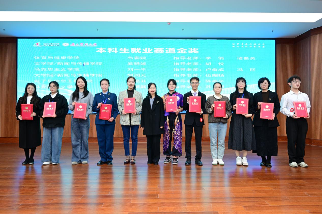 在本科生就业赛道中,2022级体育教育专业韦春婉凭借目标明确的职业路径设计、扎实的专业技能储备脱颖而出,以就业赛道总成绩第一名,成功摘得金奖,李俏老师、诸葛英老师获得就业赛道的优秀指导老师荣誉称号。2023级体育教育专业李嘉健、李笑岩同步斩获银奖。