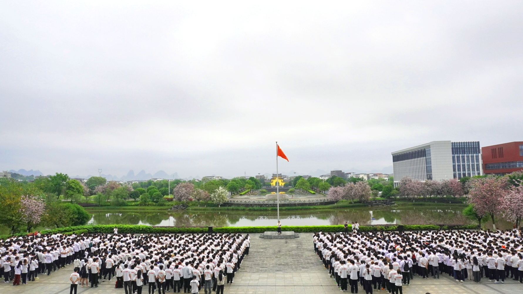 4月13日清晨,广西师范大学体育与健康学院在雁山校区图书馆前广场举行2026年春季学期升旗仪式。学院党委相关负责人出席并作讲话,全体专兼职辅导员和学生参加活动,仪式由学院团委相关负责人主持。