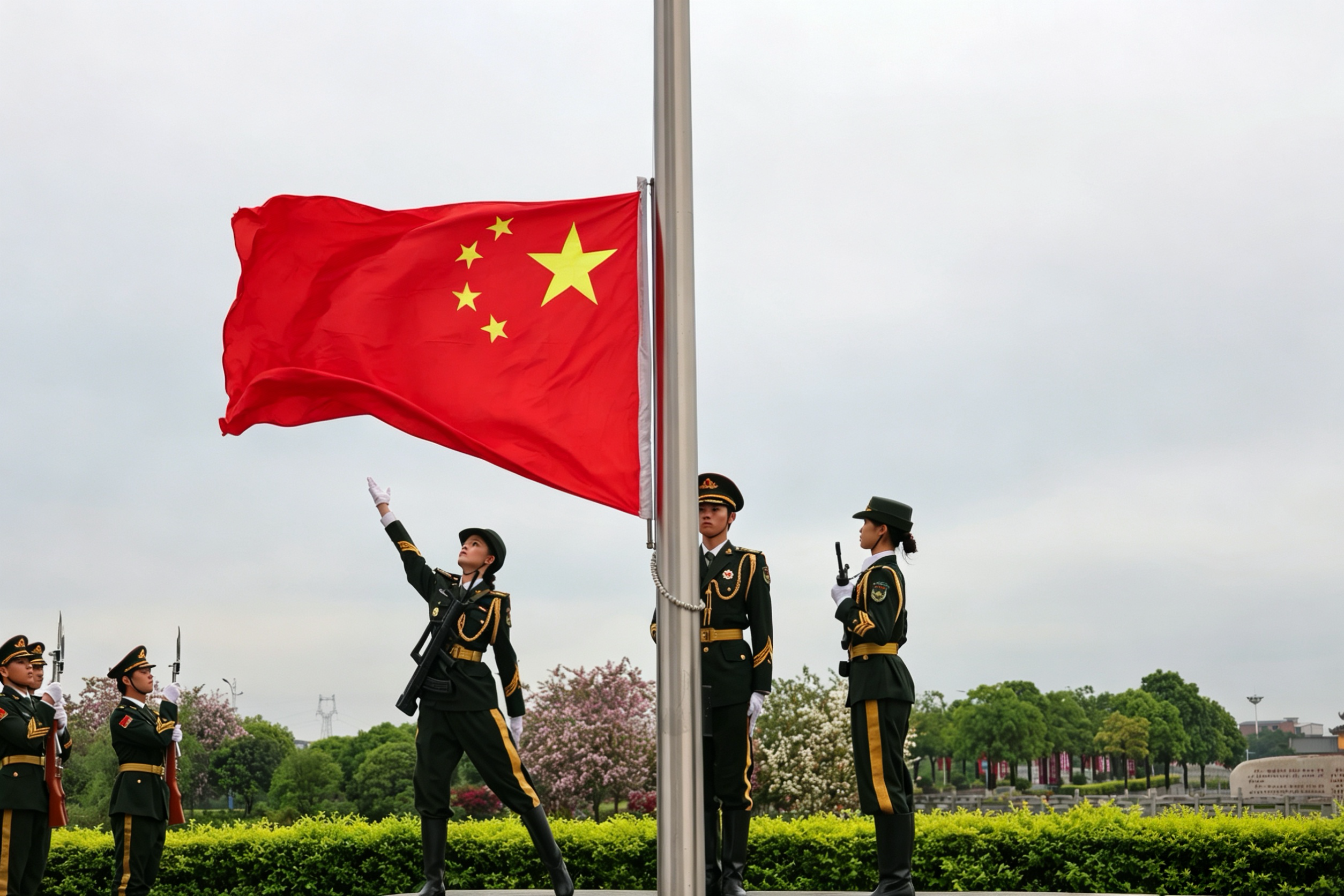 晨光之中,国旗护卫队迈着铿锵步伐护送国旗入场,雄壮国歌奏响,五星红旗冉冉升起,全体师生肃立行注目礼,致敬家国信仰与红色初心。