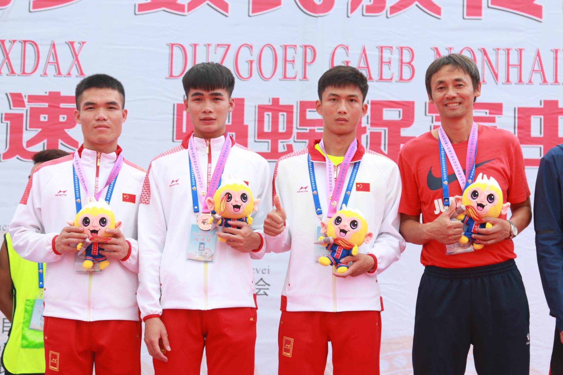教练员曾志伟老师(右一)及我院三名蚂拐运动员领奖瞬间