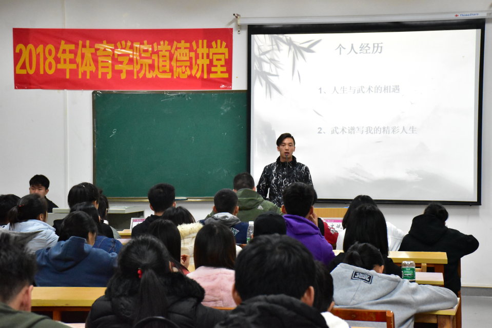 为了进一步激励体育学院学子,营造积极向上的学习氛围。11月21日晚7点,体育学院于院办201教室举办了以“体育人生,榜样引领”为主题的道德讲座。本次邀请到体育学院武术教研室老师暨全国武术锦标赛冠军胡文斌作为本次道德讲堂的主讲人。体育学院分团委书记梁炳源、分团委副书记朱喆,分团委学生会全体成员、以及2018级各专业代表共同参加了本次道德讲堂。