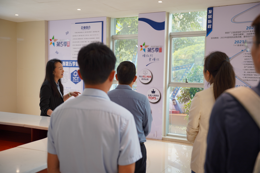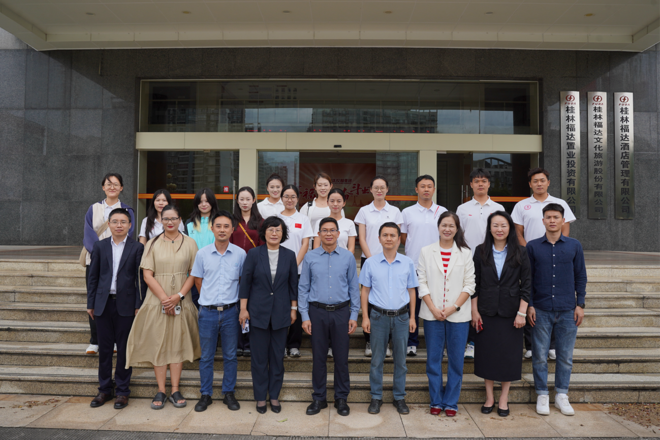 随后,师生团队前往桂林国旅大楼。冯战华经理介绍了福达文旅产业布局与发展规划。紧接着,大家步行至福达集团大楼一楼,集团总经理助理王锦明详细讲解企业党建工作,直观呈现了党建引领企业高质量发展的显著成效,引发师生深入思考。