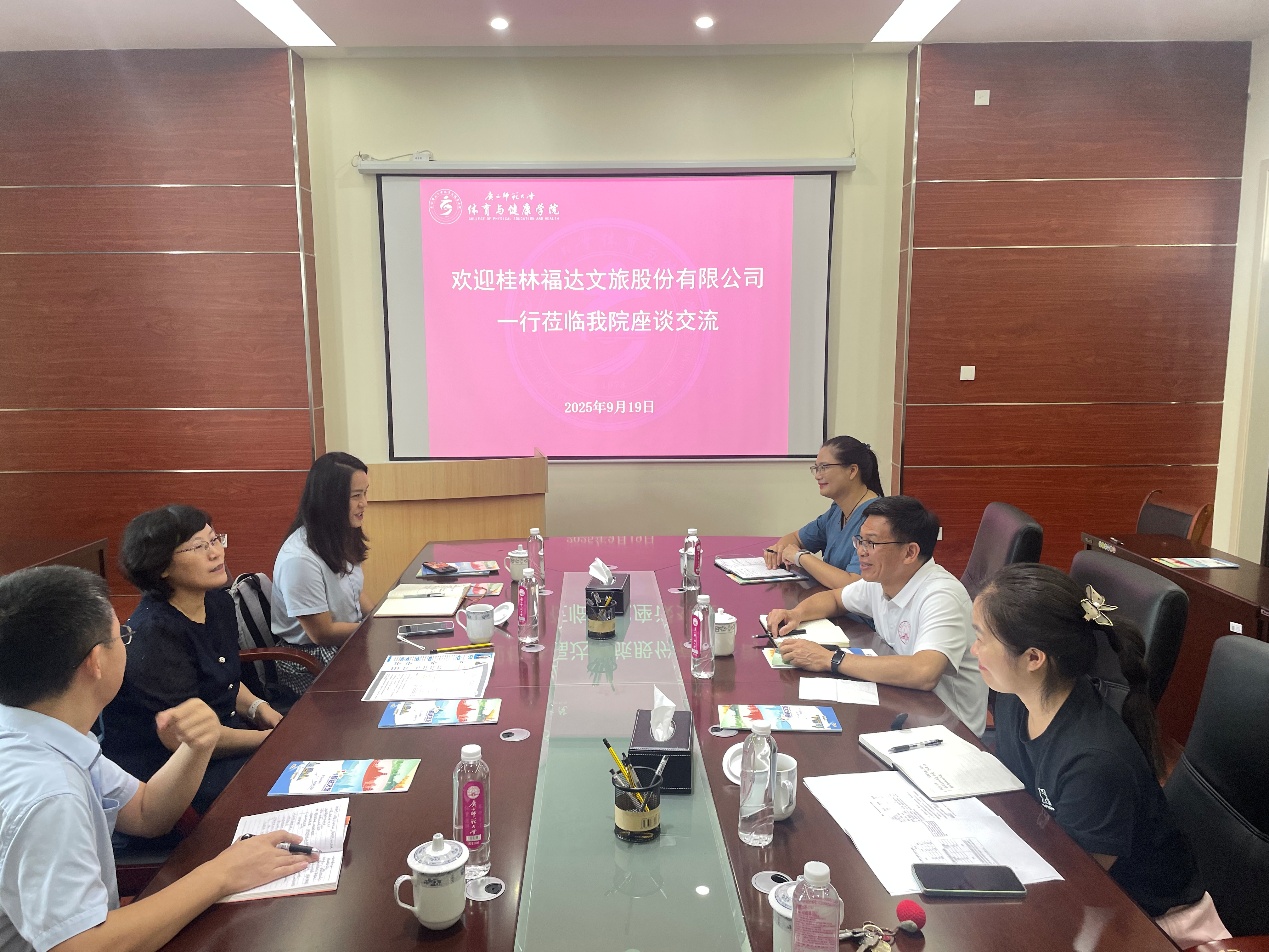 为落实产教融合国家战略,打通人才培养与产业需求衔接通道,2025年9月19日,体育与健康学院与桂林福达文旅股份有限公司召开校企合作座谈交流会,共商产教融合新机制。学院党委书记向先孟,学院党委副书记、纪委书记李俏,毕业班辅导员及硕士毕业生代表,与企业相关负责人共同参会。