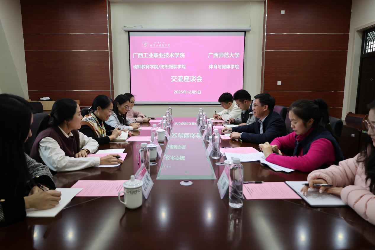 12月9日下午,广西工业职业技术学院幼师教育学院/纺织服装学院党委书记潘丽莎率队到访我院。到访后实地参观了学院学科建设成果及文化长廊,随后,双方围绕党建与育人深度融合开展座谈交流。体育与健康学院党委主要负责人主持会议,两院相关负责人、教师代表参加座谈。