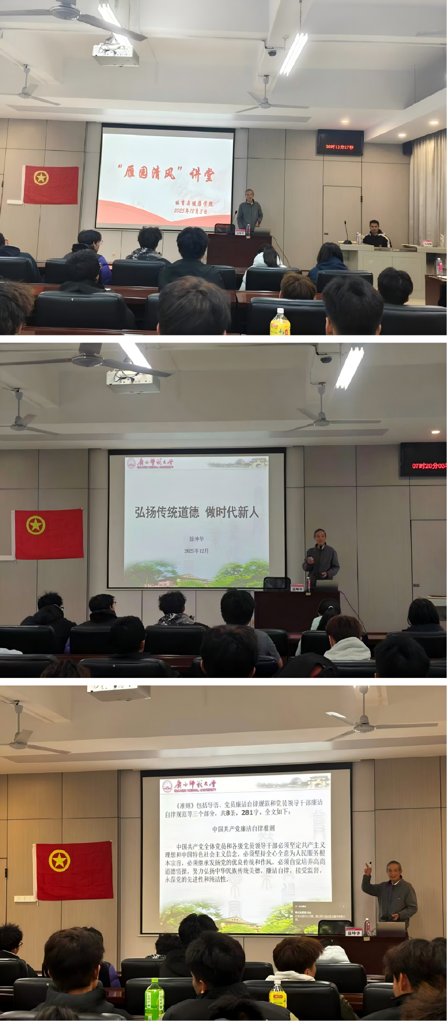 活动现场,徐坤华老师以“弘扬传统道德 做时代新人”为主题,先详细阐释“孝、悌、忠、信、礼、义、廉、耻”的中华传统“八德”内涵,结合日常场景解读感恩敬老、诚信守礼等美德的具体践行方式进行授课;随后又引入《中国共产党廉洁自律准则》内容,将传统道德中的“廉”等理念,与当代廉洁自律、作风建设要求相衔接,引导同学们理解美德的时代延伸价值。